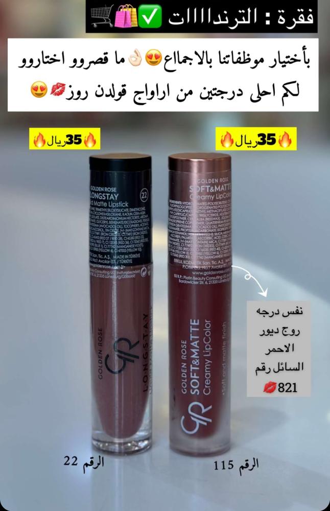 أحمر شفاه قولدن روز فيلفيت غير لامع يخلق لمسة مخملية غير لامعة تدوم طويلاً على الشفاه.